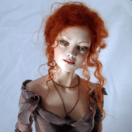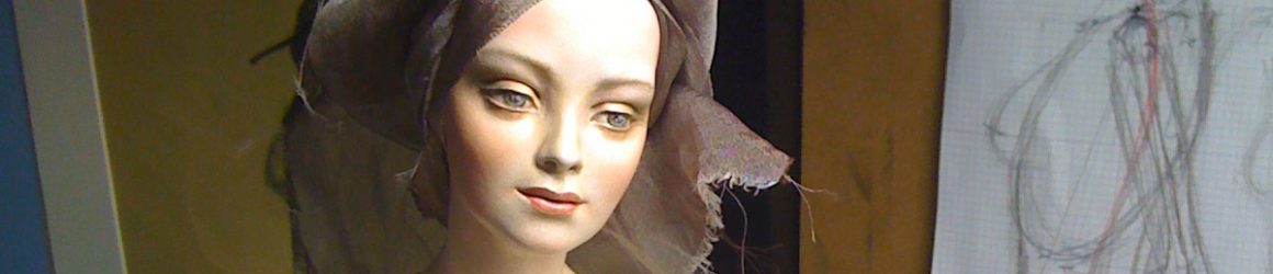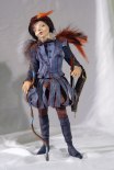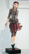 ‘Alexandra’ 23″ high, made on 2012, material paper clay, painted with oil paint, costume made of silk, Japanese beads, leather, metal elements.