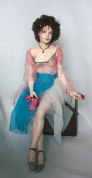 ‘Eva’ 13″ high seated, made on 2011, material paper clay, painted with oil paint, costume made of silk, silk embroidery, Japanese beads, swarovski crystals, metal.
